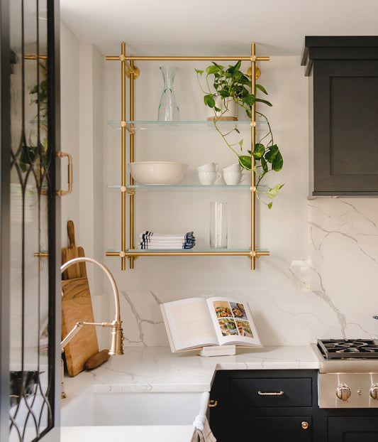 Ceiling + Wall Mounted | Bistro Shelving | Warm Brass with Glass Shelves | Amuneal Collector's Series
