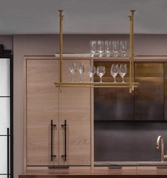 Ceiling Mounted | Suspended Shelving | Warm Brass with Glass Shelves | Amuneal Collector's Series